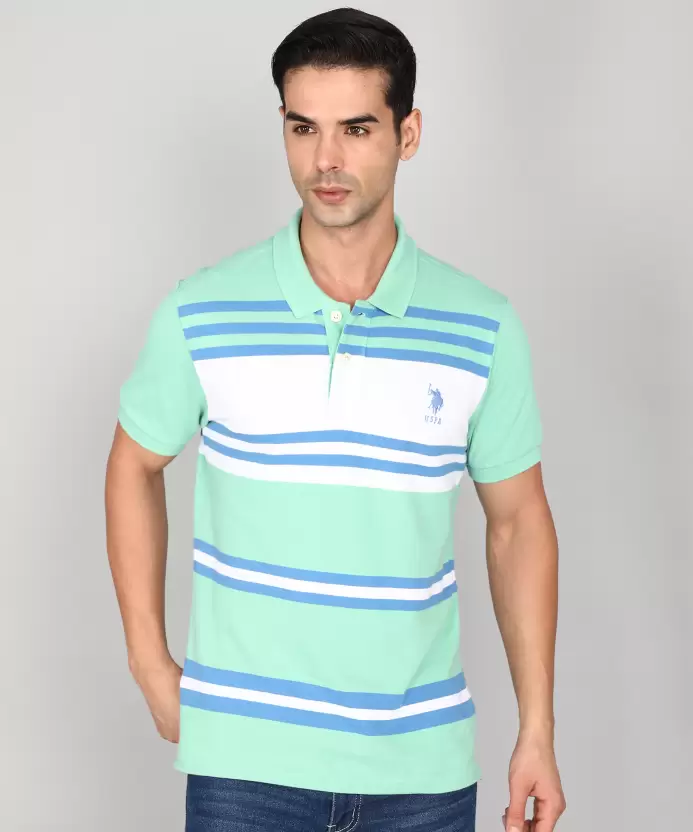 Home Clothes U.S. POLO ASSN. Men Striped Polo Neck Pure Cotton Green T-Shirt